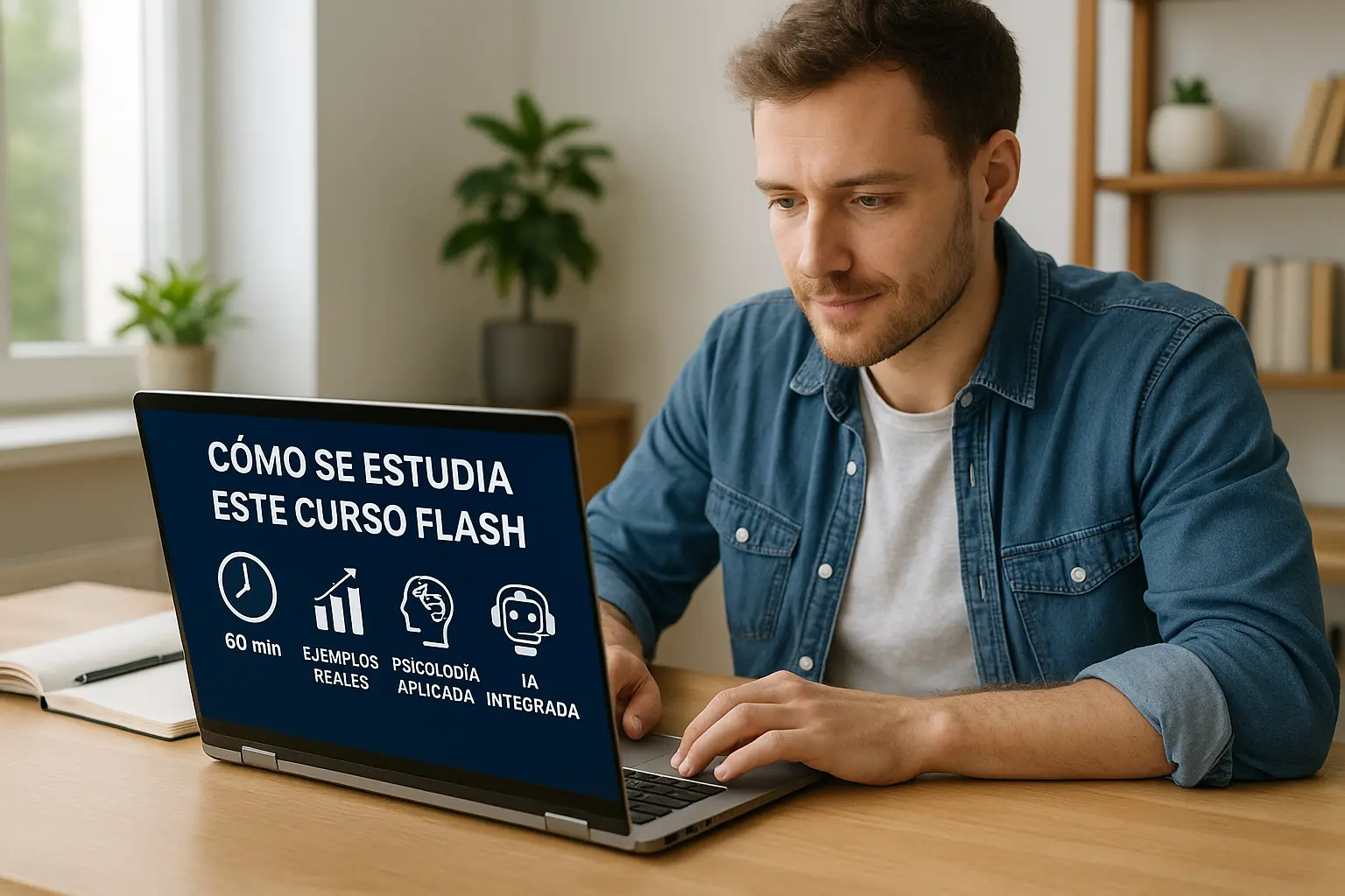 ⏱️ 60 min, 📈 Ejemplos reales, 🧠 Psicología aplicada, 🤖 IA integrada.